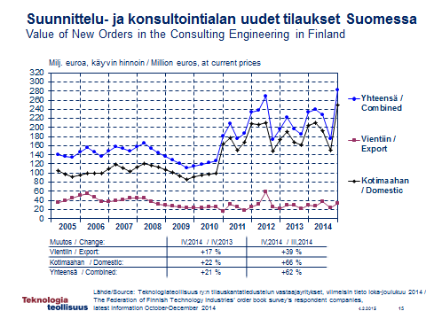 Kokonaiskasvu suunnittelu- ja konsultointiyritysten tilauskannassa oli seitsemän prosenttia edellisestä vuosineljänneksestä, ja 18 % viime vuoden vastaavasta neljänneksestä teknologiateollisuuden aikasarja-analyysin perusteella. Identtisissä vastaajayrityksissä (SKOLin oma laskelma) kasvu edellisestä neljänneksestä oli 5 % ja vuoden takaisesta 16 %. Toimialakohtaiset tarkastelut on tehty SKOLin aineiston perusteella.